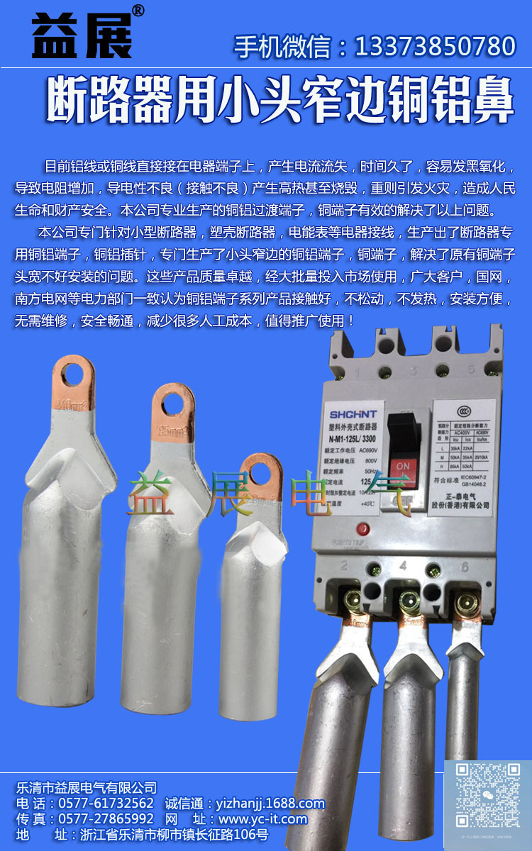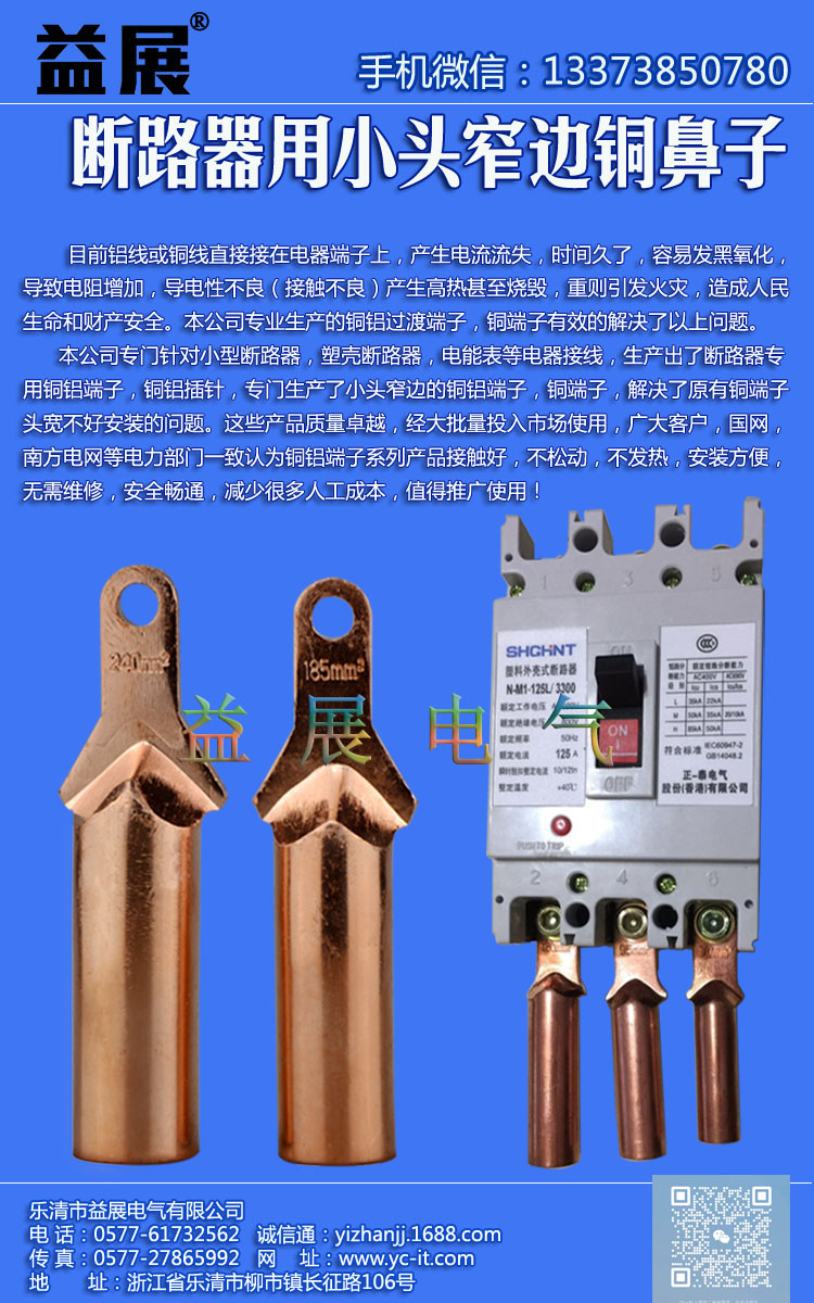 斷路器專用銅鼻子,DTX-35鍍錫銅鼻子,窄頭銅鋁線鼻子,益展電氣專業(yè)生產(chǎn)各種銅鼻子,雙孔銅鼻子,銅鋁過渡線鼻子,SC窺口線鼻子,雙孔銅鋁鼻子,冷熱縮電纜附件,穿刺線夾,堵油銅鼻子,冷壓端子,C45插針,OT開口鼻子,管型冷壓端頭,銅鋁線夾,接線端子,接插件,壓線帽,等各系列配線器材。廠家直銷,價格優(yōu),質(zhì)量高。歡迎與各界人士合作。